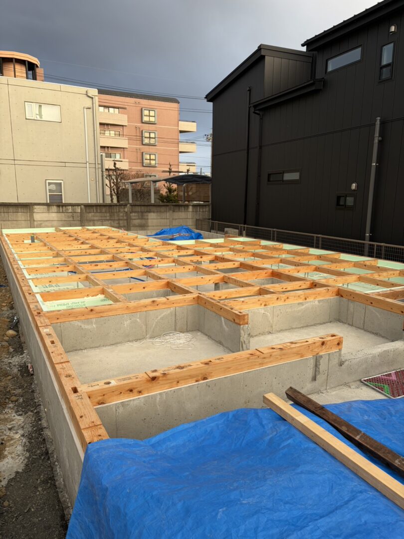 コンクリート打設が完了すると次工程は土台敷きに移ります。