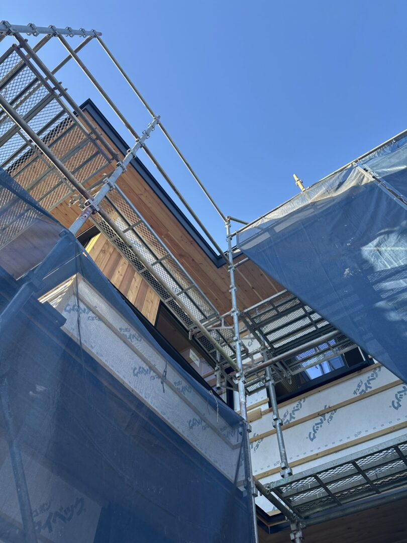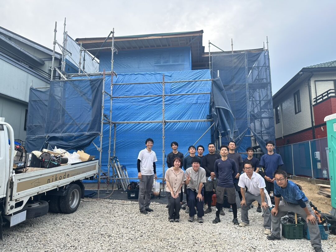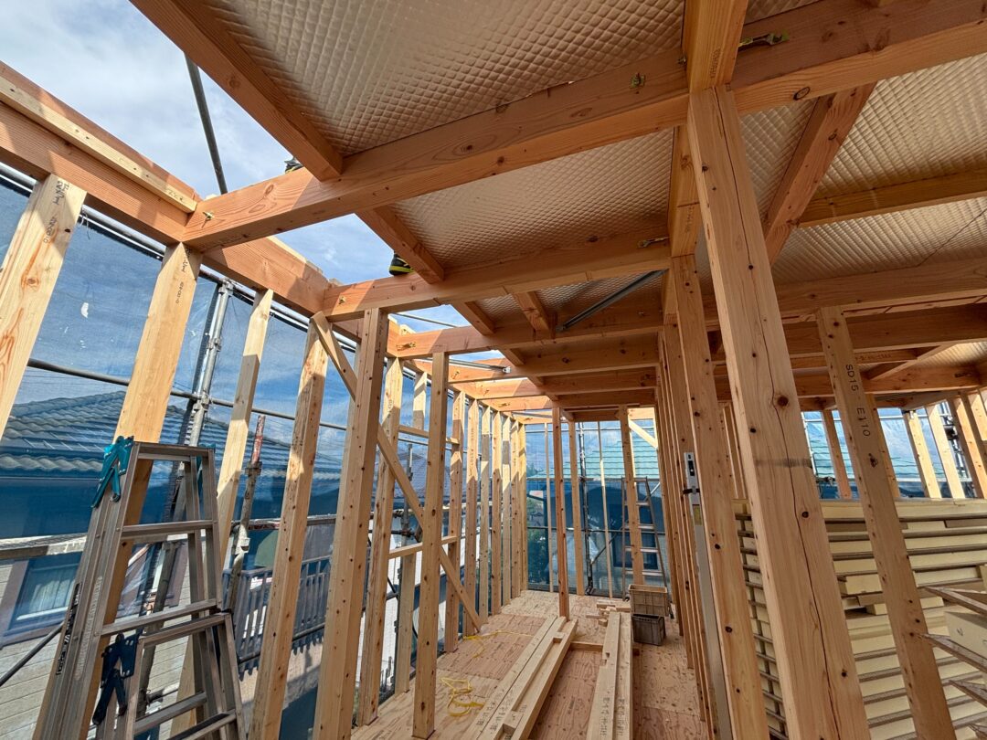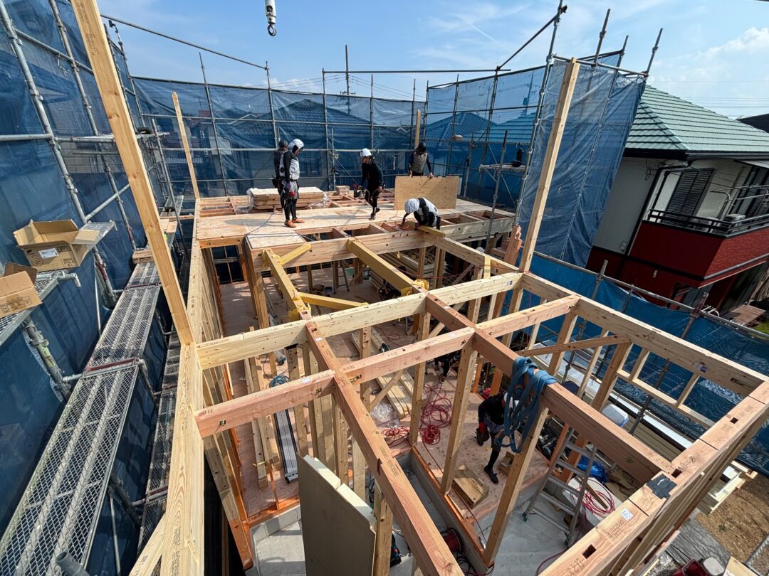 お昼の時間には実際にI様に上棟中の現場を見学していただきました。