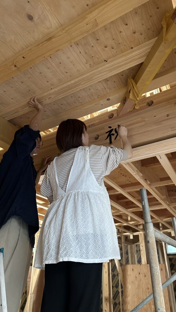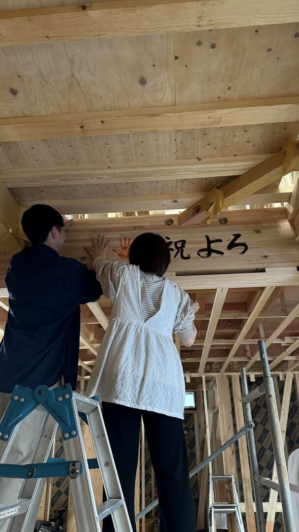 上棟でかかった梁に想いを込めて手形やメッセージを書いていただく手形式